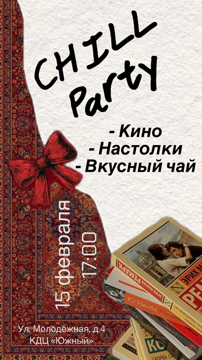 ✨ Chill party: февральская история Гайд по идеальному вечеру: чай, кино, настолки и отличная компания! Всё просто: уютное место, приятные люди и занятия для души. Настольные игры, вкусный чай, хорошее кино и приятное общение — лучший способ забыть о холодах за окном. Приходи отдохнуть, познакомиться и согреться. P.S. Захвати с собой любимые сладости и друга. Будет по-настоящему уютно 🩷 🚫 Возраст: 6+ 📆 15.02.2026 🕒 17:00 🏢 КДЦ "Южный" 📍 г. Подольск, ул. Молодежная, 4 💰 Вход свободный❗️ ⭐Поддержать канал голосом 🍰Где поесть в Подольске ✅ Мероприятия Подольск https://dzen.ru/id/66ed500f7b5671493eca3fd6 http://vk.com/podolsk_events http://dzen.ru/podolsk_events