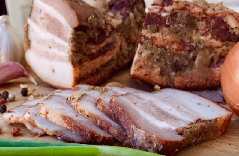 Готовится кушанье банально просто, но получается изумительно вкусное кушанье с ярким чесночным ароматом, а внешне оно похоже на подкопченное. Лучше всего брать подчеревок или грудинку, где чередуются прослойки сала и мяса.