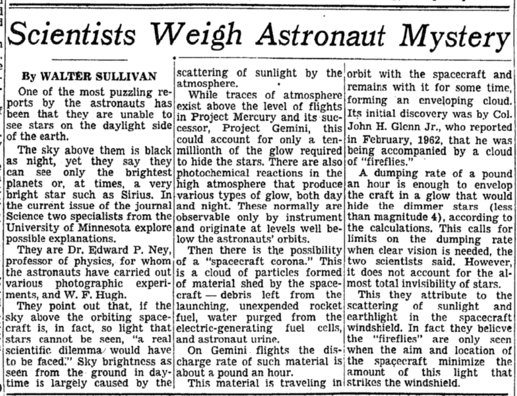 Много воды, ученые ищут разгадку в каком-то мусоре, который летает около космического корабля (тогда это Джемини). Но интересен сам факт - астронавты звезд на дневной стороне НЕ ВИДЯТ. Видят лишь самые яркие - планеты и звезды первой (минусовой) величины. И для ученых это странно. Они были уверены в обратном! Как и современные конспирологи.