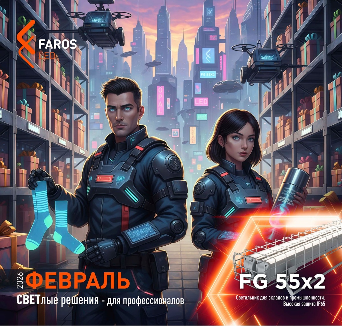 🔥 В феврале показываем страницу, посвященную складскому и промышленному освещению. 💫 FG 55x2 – промышленный сдвоенный светильник FAROS LED с высокой степенью защиты IP65. Герметичный алюминиевый корпус надежно изолирует диоды и драйвер от проникновения пыли и влаги, что делает изделие оптимальным для освещения промышленных объектов и складов. ➡️ FG 55x2 обладает: • Сдвоенной конструкцией, обеспечивающей максимальный уровень энергоэффективности и освещенности (до 147 лм/Вт); • Простым быстрым монтажом на поворотный кронштейн; • Климатическим исполнением УХЛЗ.1, от -20 до +40 °C / от 0 до +40 °C - для исполнений с БАП (EM). • Гарантией 5 лет. Серия FG 55x2 разнообразна по исполнениям: - ряд мощностей варьируется от 75W до 200W; - три варианта габаритной длины: 976/1276/1576 мм; - опции: с блоком аварийного питания (EM); с повышенной цветопередачей CRI>90 и защитной решеткой для использования в школах и на спортивных объектах (SPORT); - на выбор доступны два вида поликарбонатного расс