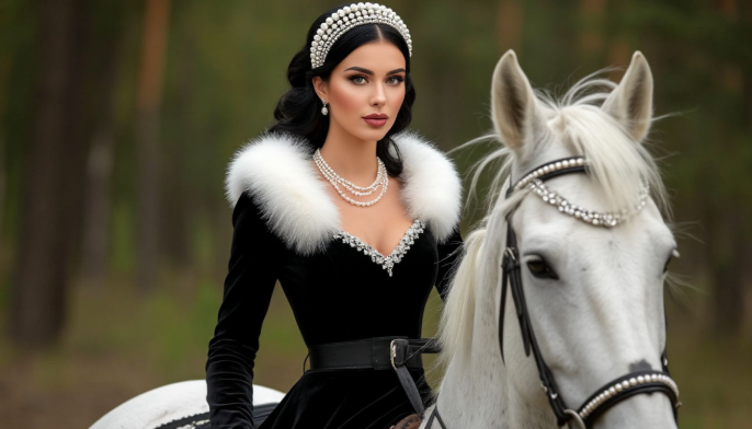 Через какое-то время прискакали двое всадников, ведя в поводу коня, на котором сидела редкой красоты женщина в черном платье отороченным белым мехом. Её шею украшала ожерелье из крупного жемчуга, а на голове сказочно дорогой венец из жемчуга