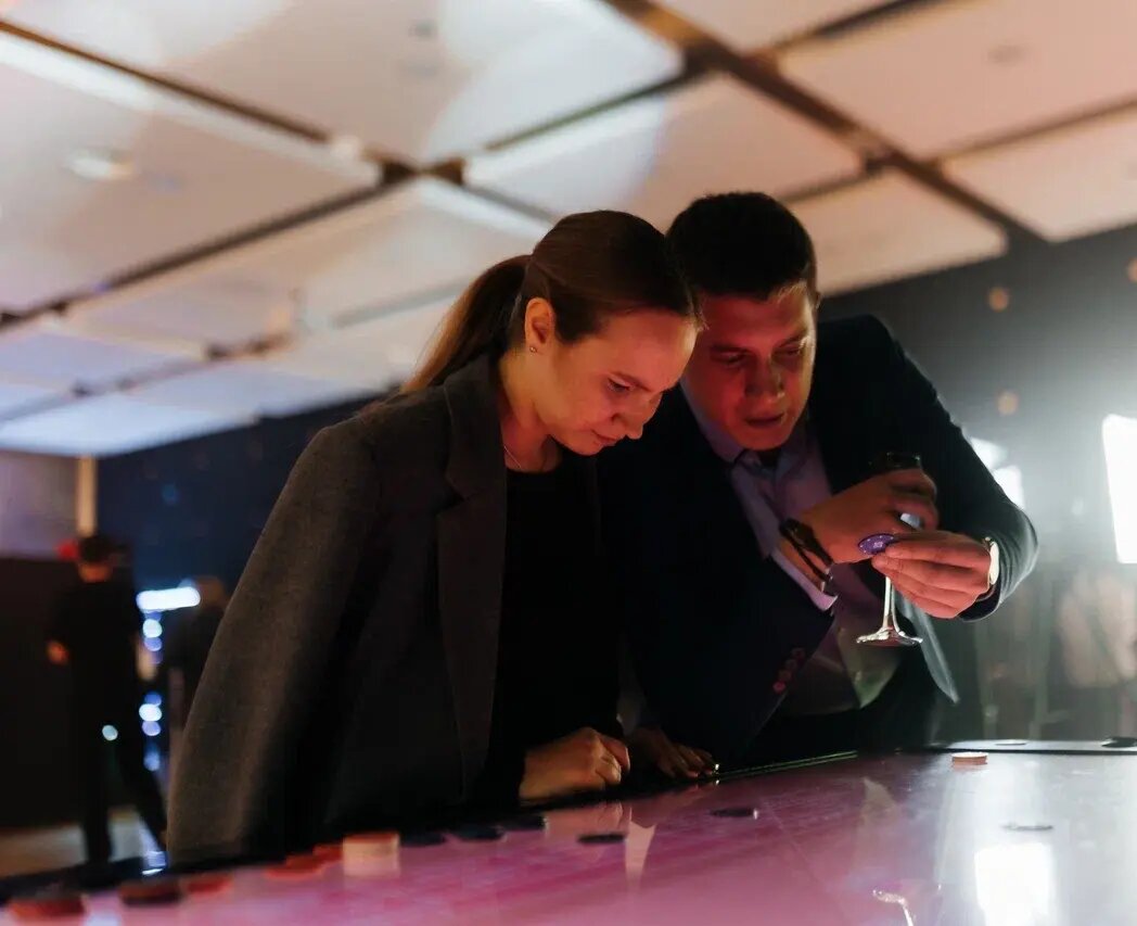 Форматы, которые понравятся женской аудитории 8 марта на мероприятиях — это не про громкие конкурсы и активное соперничество. Чаще всего гостям важны атмосфера, эстетика, внимание к деталям и возможность получить красивый, персональный опыт. Мы собрали интерактивы, которые особенно хорошо работают на женскую аудиторию — по нашему опыту и по отклику гостей. Винное казино нравится женской аудитории за сочетание лёгкого азарта и эстетичного досуга. Это формат, где не нужно спешить или соревноваться на скорость — можно спокойно дегустировать, обсуждать вкусы и открывать для себя новые оттенки вина. Эксперты в процессе игры помогают разобраться в ароматах, рассказывают, как выбирать вино в ресторане, подбирать бокалы и сочетать напитки с настроением. Интерактив превращается в приятный вечерний ритуал, где знания усваиваются легко, а атмосфера располагает к общению. Комплект алкоголя оплачивается отдельно (в среднем 4–5 бутылок на час игры), оставшиеся вина после мероприятия передаются клиен