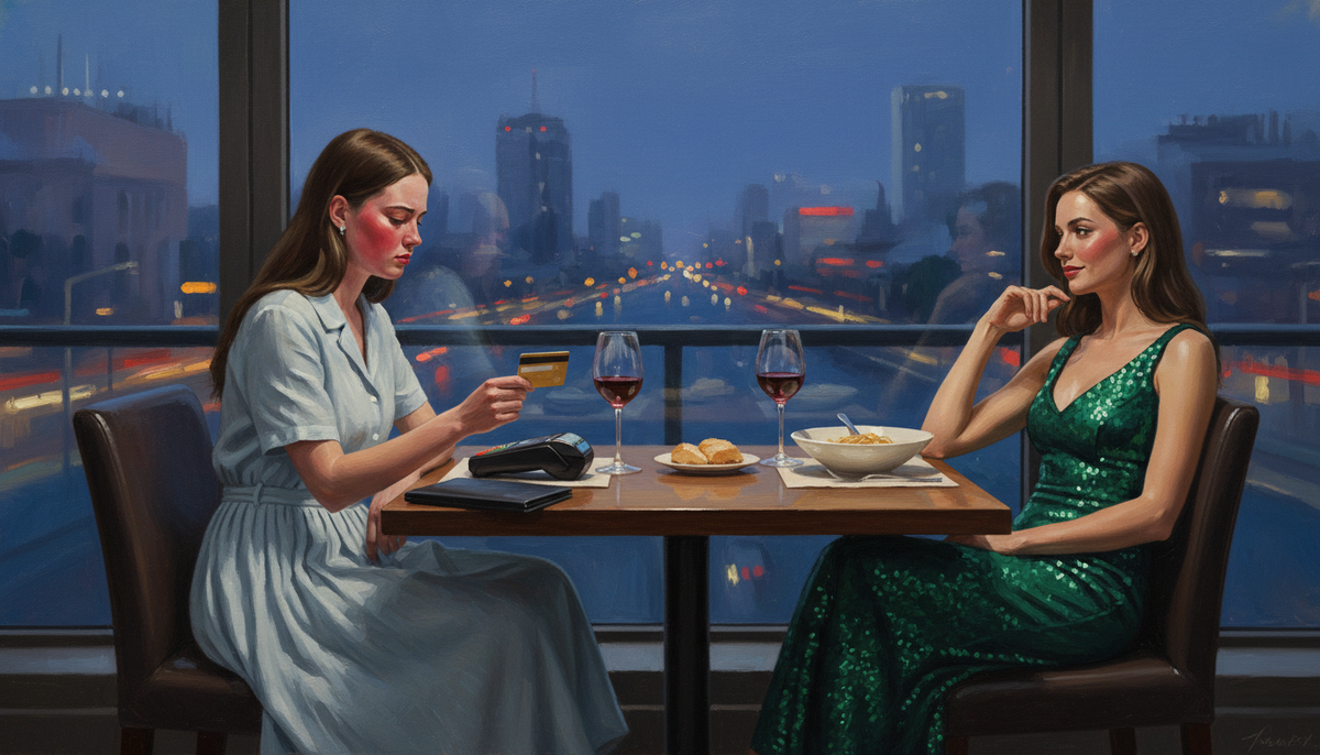 Марина пригласила трёх подруг на день рождения в итальянский ресторан. Центр города, панорамные окна, счёт на пятьдесят тысяч. Когда официант принёс терминал, Марина сказала: "Давайте каждый за себя." Света покраснела, достала карту, оплатила двенадцать тысяч. Ехала домой и плакала. Зарплата Марины — четыреста двадцать тысяч. Зарплата Светы — сорок восемь. Разница почти в десять раз. Света рассказала мне эту историю через две недели. Мы сидели на кухне, она курила на балконе, а я смотрела на её руки — они дрожали, когда она прикуривала. "Понимаешь, — говорила Света, — я же не жадная. Но двенадцать тысяч — это треть моей зарплаты после всех платежей. А для Марины это полдня работы." Я вспомнила свою историю. Моя бывшая коллега Ольга вышла замуж за бизнесмена. Квартира в центре, машина с водителем, отпуск три раза в год. Мы дружили пять лет, встречались каждый месяц. Она всегда выбирала место. Всегда дорогое. Всегда говорила: "Не беспокойся, я приглашаю." Через два года что-то изменилось