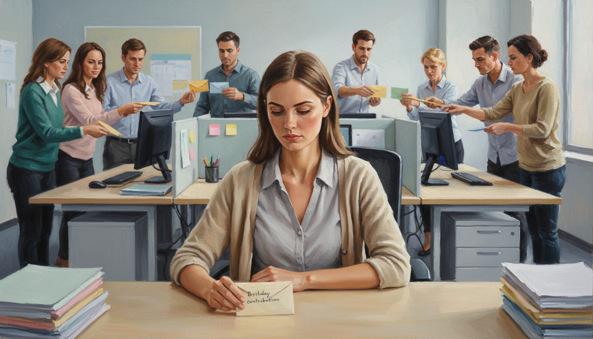 Лена пришла в отдел и увидела конверт на столе. «На Светин день рождения, по пятьсот», — бросила коллега. Лена молча отодвинула конверт. Неделю её не звали на обеды. Месяц назад Светлана показывала фото из Турции. Пятьсот рублей за подарок женщине с отпуском за сто тысяч. Я считала недавно. За год в моём отделе двенадцать дней рождения. По пятьсот рублей каждый раз. Шесть тысяч в год на подарки людям, с которыми я просто сижу в одном помещении. Это абонемент в бассейн на полгода. Или десять книг. Или неделя в санатории для мамы. Моя подруга Марина работает в банке. У них традиция — скидываться не только на дни рождения. На свадьбы, рождение детей, юбилеи родителей коллег. В прошлом году она отдала восемнадцать тысяч. На подарки людям, имена половины которых не помнит. «Ты же понимаешь, как это выглядит», — сказала ей начальница, когда Марина попросила не включать её в сборы. «Мы же коллектив. Мы же семья». Марина промолчала. Семья не берёт пятьсот рублей за право на существование. Вот