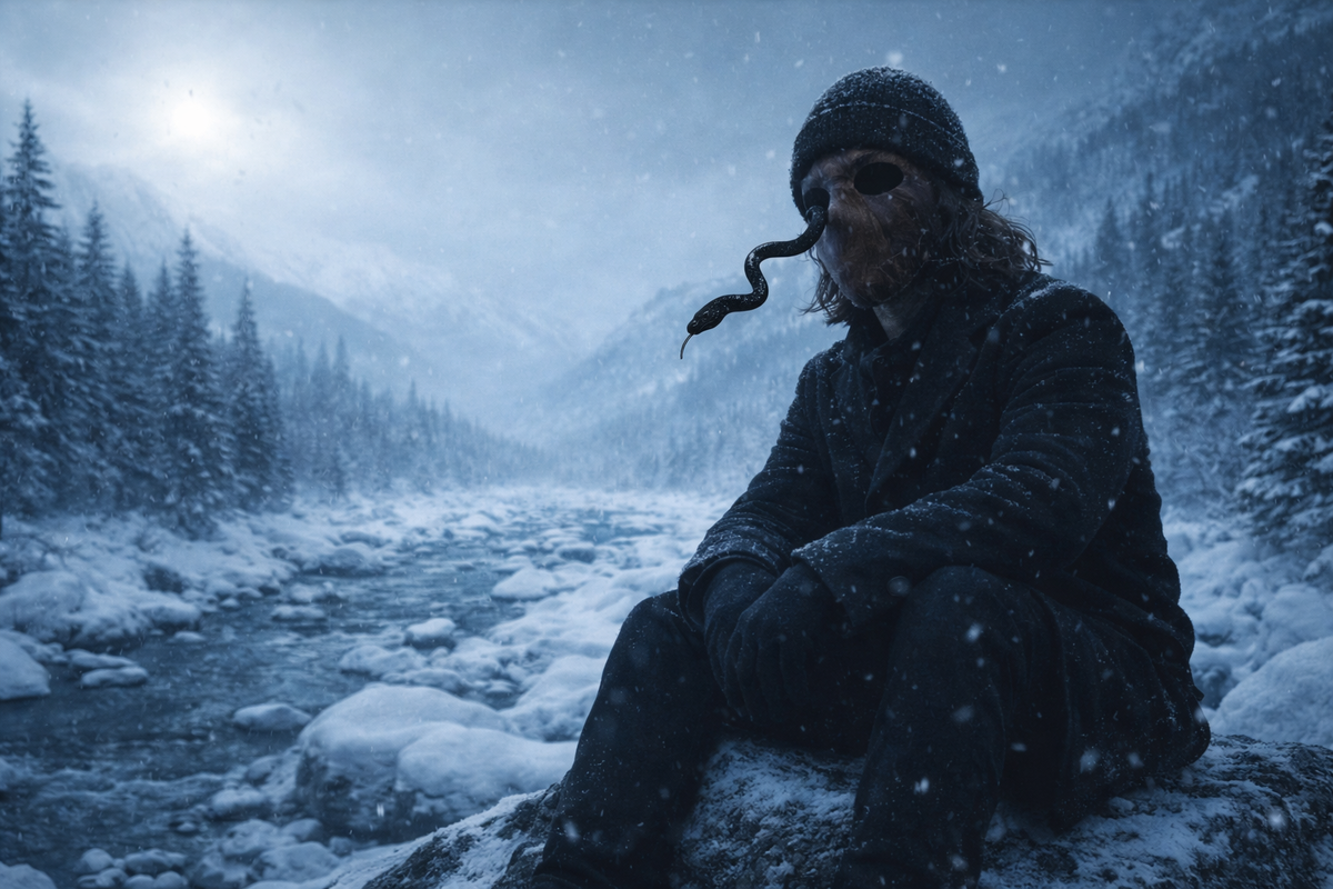Вдруг впереди я вижу фигуру человека, который сидит на большом камне спиной ко мне. Я подхожу ближе и вижу Пашино пальто. Он сидит неподвижно. Я начинаю медленно обходить его и вдруг вижу на его лице маску, сделанную из кожи с нарисованными на ней шаманскими рисунками. Сама маска очень странная и устрашающая: вместо носа две маленькие дырочки, а прорезь рта сшита толстыми нитками. Я не вижу его глаз — в тех местах, где они должны были быть, чёрная пустота, и в этой пустоте как будто что-то шевелится. Я смотрю на эту ужасную маску, и она пугает меня до ужаса, и вдруг из одного глаза начинает выползать чёрная змея, и я не выдерживаю и просыпаюсь.