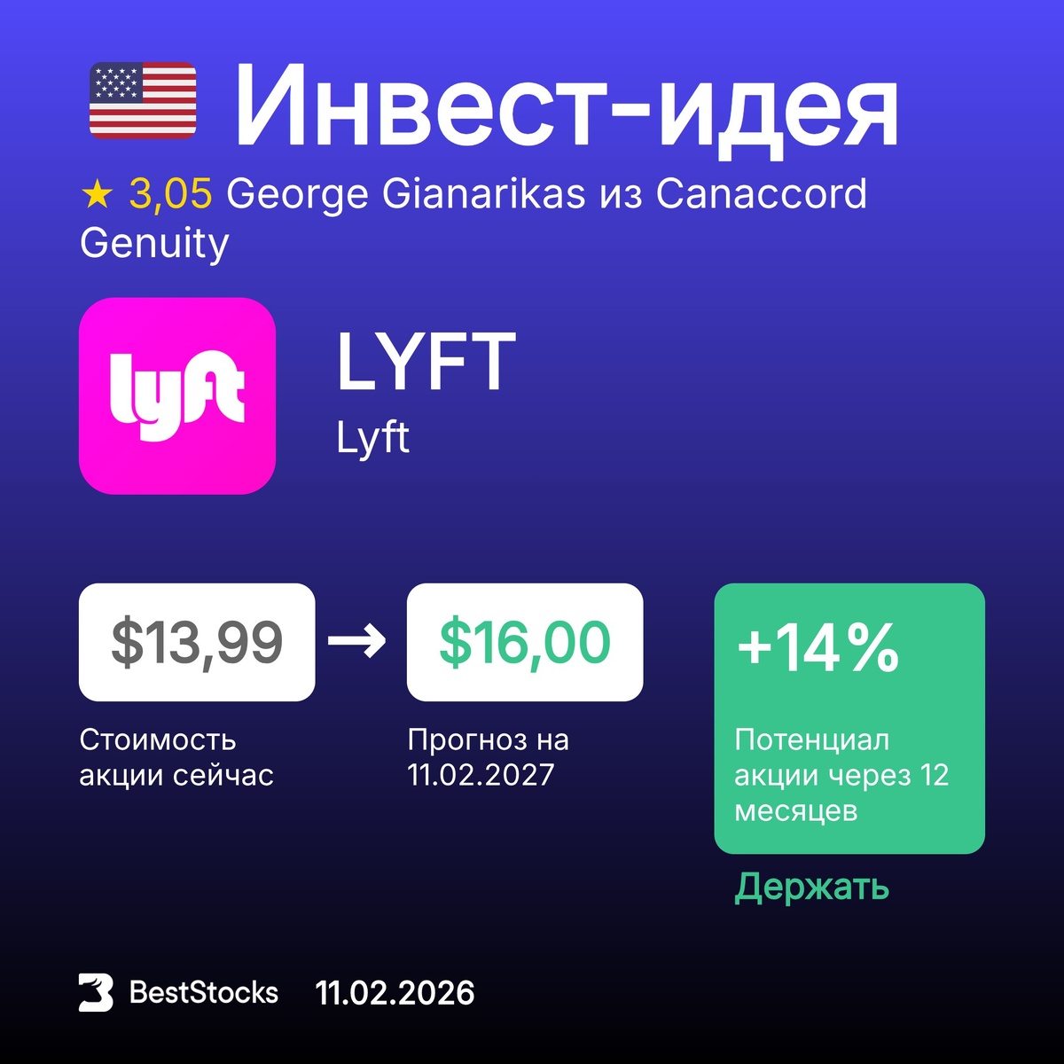 Π’ΠΈΠΊΠ΅Ρ: LYFT ΠΡΠΎΠ³Π½ΠΎΠ·Π½Π°Ρ ΡΠ΅Π½Π°: $16 (+14%) Π Π΅ΠΊΠΎΠΌΠ΅Π½Π΄Π°ΡΠΈΡ: ΠΠ΅ΡΠΆΠ°ΡΡ InvestRank Π°ΠΊΡΠΈΠΈ: 8 ΠΈΠ· 10 ΠΡΠΎΠ³Π½ΠΎΠ· ΡΠ΄Π΅Π»Π°Π½: 11.02.2026 ΠΡΠΎΠ³Π½ΠΎΠ· Π΄ΠΎ: 11.02.2027 ΠΠ½Π²Π΅ΡΡ-ΠΊΠΎΠΌΠΏΠ°Π½ΠΈΡ: Canaccord Genuity ΠΠ½Π°Π»ΠΈΡΠΈΠΊ: George Gianarikas ΠΡΡ ΡΠ΅ΠΊΠΎΠΌΠ΅Π½Π΄Π°ΡΠΈΠΈ Π½Π° ΡΠ΅Π³ΠΎΠ΄Π½Ρ β β’β’β’β’β’ π’ ΠΠ΅ΡΠΊΠΎΠ»ΡΠΊΠΎ ΡΠ°Π· Π² Π½Π΅Π΄Π΅Π»Ρ ΠΏΠΎΠ»Π½ΠΎΡΠ΅Π½Π½ΡΠ΅ Π°Π½Π°Π»ΠΈΡΠΈΡΠ΅ΡΠΊΠΈΠ΅ ΠΎΠ±Π·ΠΎΡΡ ΡΡΠ½ΠΊΠ° Π‘Π¨Π. ΠΠ°Π½ΠΈΠΌΠ°ΡΠ΅Π»ΡΠ½ΠΎ ΠΈ ΠΏΡΠΎΡΡΠΎ Π΄Π»Ρ ΠΏΠΎΠ½ΠΈΠΌΠ°Π½ΠΈΡ Π΄Π°ΠΆΠ΅ Π΄Π»Ρ Π½ΠΎΠ²ΠΈΡΠΊΠΎΠ².