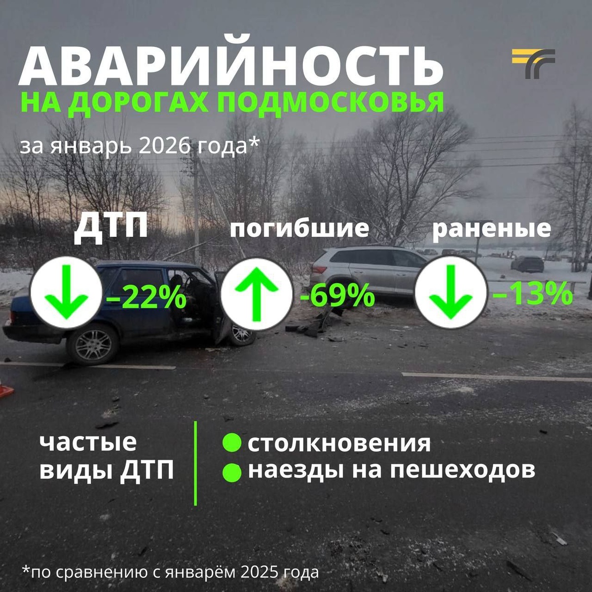 В январе на дорогах Подмосковья зафиксировано 177 ДТП, в которых погибли 16 человек, а 216 человек получили травмы. По сравнению с январём 2025 года: ⬇️ на 22% снизилось число ДТП ⬇️ на 69% снизилось число погибших ⬇️ на 13% снизилось число раненых