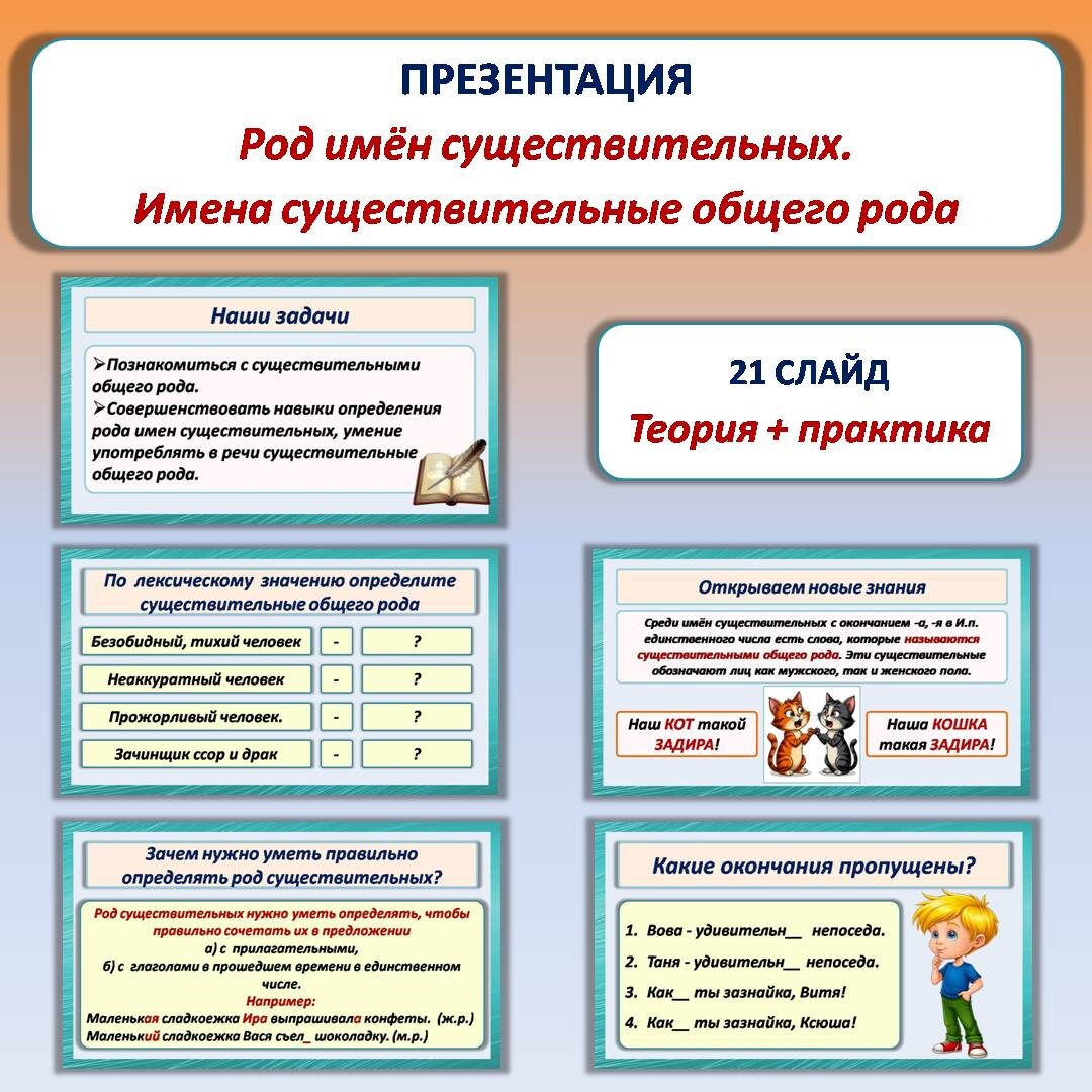 Презентацию скачать здесь Презентация «Род имён существительных. Имена существительные общего рода» разработана к уроку русского языка в 5 классе. Состоит из 21 слайда. Презентация представляет собой готовую разработку урока русского языка в 5 классе. Слайды расположены в соответствии с этапами занятия: В основе урока лежат принципы проблемного подхода. Сначала ученики анализируют предложенные предложения, делают самостоятельные выводы, и только после этого получают формулировку нового правила.
