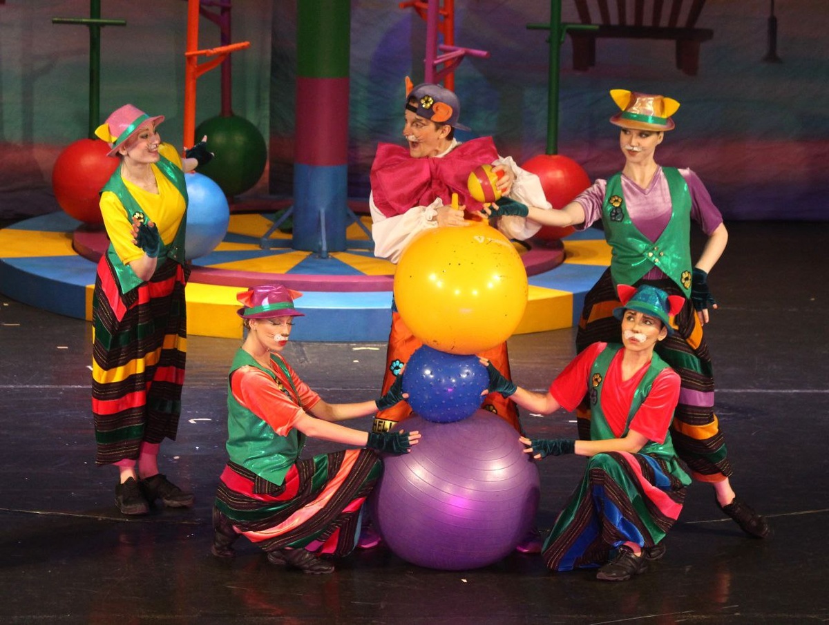 "Приключения кота Леопольда", сцена из спектакля. Леопольд - Антон Павлов, Кошки - Екатерина Пастухова, Елизавета Фоминых, Влада Уткина, Юлия Козлова.