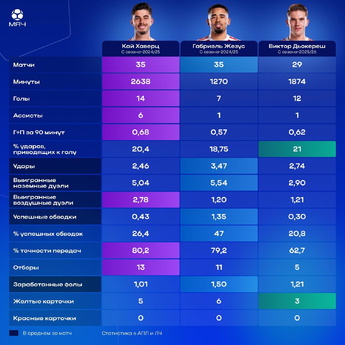 Кто должен быть основным форвардом «Арсенала»? Лучший центрнап по статистике – Кай Хаверц. Немец чаще совершает голевые действия, выигрывает верх и помогает в защите (но прямо сейчас он травмировался и пропустит минимум два ближайших матча). Виктор Дьокереш эффективнее бьет по воротам и реже получает карточки, но по остальным показателям уступает конкурентам. А Габи Жезус хорош в обводках, заработанных фолах и наземных дуэлях. Вот только голевые действия даются ему тяжелее. А кто должен быть в основе «Арсенала» по-вашему? @myach