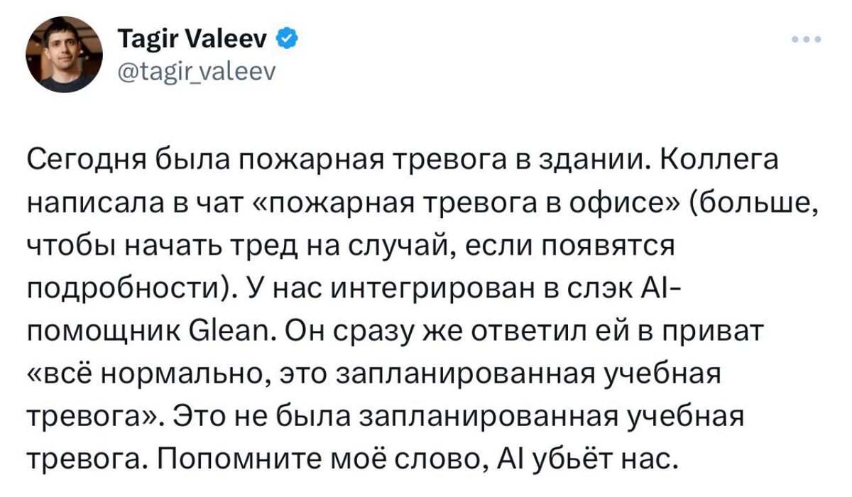 🔥 В офисе JetBrains сработала пожарная тревога, о чем одна из сотрудниц написала в чат. Тут же встроенный ИИ-помощник Glean сказал, что это запланированная учебная тревога и можно оставаться на своих местах. Ну и да — вскоре к зданию подъехали пожарные. Странно, что ИИ потом не написал: «Ты прав, это не учебная тревога, хочешь, я подскажу что делать при ожогах» 💀 @xor_journal Источник: XOR