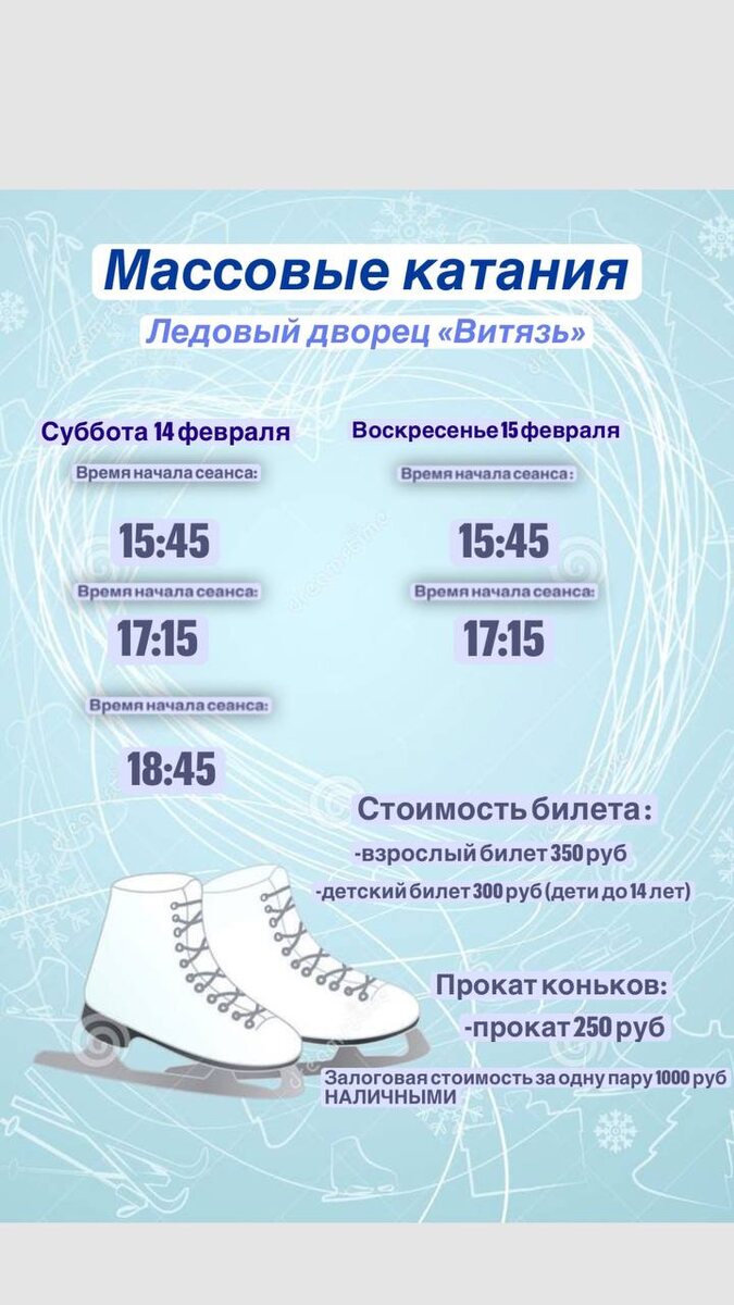 🗓️14.02.2026 ( суббота ) В 15:45 В 17:15 В 18:45 🗓️15.02.2026 (воскресенье) В 15:45 В 17:15 ⛸Стоимость билета: - взрослый билет 350 рублей, - детский билет 300 рублей (дети до 14 лет), 💫 проход на трибуны платный - 50 рублей. ‼️Билеты начинаем продавать за час до сеанса и их количество ограничено‼️ ПРО КОНЬКИ ⛸⛸ 💫 прокат коньков - 250 рублей 💫 Залоговая стоимость за пару 1 000 рублей (НАЛИЧНЫМИ!!!!) вносится в пункте проката и возвращается при возврате коньков. Ждем Вас на льду!⛸️ 📆 14.02.2026 и 15.02.2026 🏢 ЛЕДОВЫЙ ДВОРЕЦ «ВИТЯЗЬ» 📍 г. Подольск, ул. Кирова, д. 63а ⭐Поддержать канал голосом 🍰Где поесть в Подольске ✅ Мероприятия Подольск https://dzen.ru/id/66ed500f7b5671493eca3fd6 http://vk.com/podolsk_events http://dzen.ru/podolsk_events