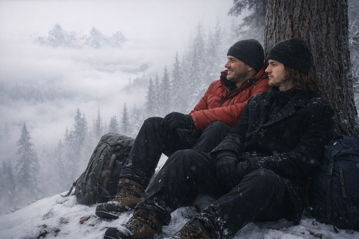 Вдобавок к этому начало смеркаться или туман сделался плотнее, но вдруг стало очень темно. Я предложил найти ровную площадку и установить палатку, а утром будет видно. Мы установили палатку и закинули внутрь коврики и спальные мешки. Затем принялись собирать дрова и разожгли костёр. Разогрели ужин, поели и, растопив снег в кружках, заварили чай.