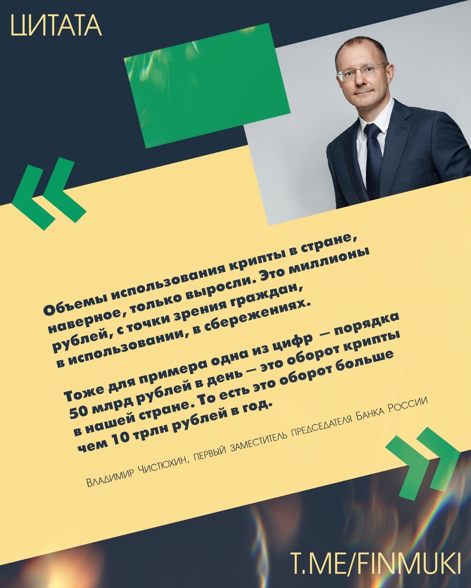 Это миллионы рублей, с точки зрения граждан, в использовании, в сбережениях. Тоже для примера одна из цифр — порядка 50 млрд рублей в день — это оборот крипты в нашей стране. То есть это оборот больше чем 10 трлн рублей в год». Владимир Чистюхин, первый заместитель председателя Центрального банка Российской Федерации #цитата #крипта @finmuki