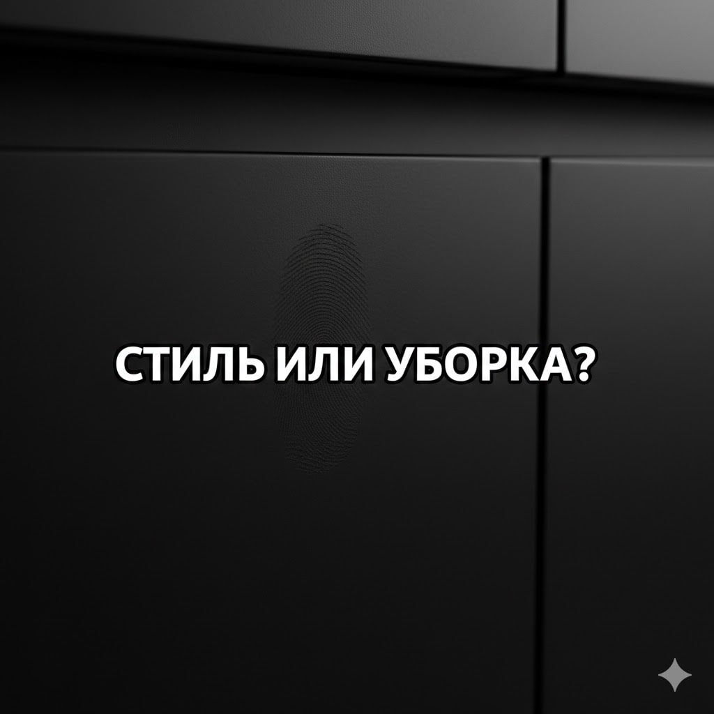 Все мы видели эти стильные рендеры: глухие черные шкафы, идеальный матовый финиш, ни одной лишней детали. Выглядит на миллион! Но готовы ли вы к реальности? Главные проблемы черного мата: Отпечатки пальцев. Даже если вы помыли руки 5 раз, на черном мате останется след. Каждое касание превращается в «жирное» пятно, которое видно под любым углом. Известковый налет. Если вода попала на фасад и высохла — останется белесое пятно. Пыль. Она на черном цвете видна так, будто вы не убирались месяц, хотя протерли всё полчаса назад. Как спасти ситуацию, если очень хочется: — Покрытие Anti-fingerprint. Существуют специальные нано-пластики (например, Fenix), которые реально сопротивляются отпечаткам. Дороже, но оно того стоит. — Текстура. Выбирайте черный «под дерево» или с мелкой шагренью. Фактура отлично маскирует следы эксплуатации. — Комбинируйте. Сделайте черными только верхние шкафы, до которых вы реже дотрагиваетесь, а низ — деревом или серым бетоном.