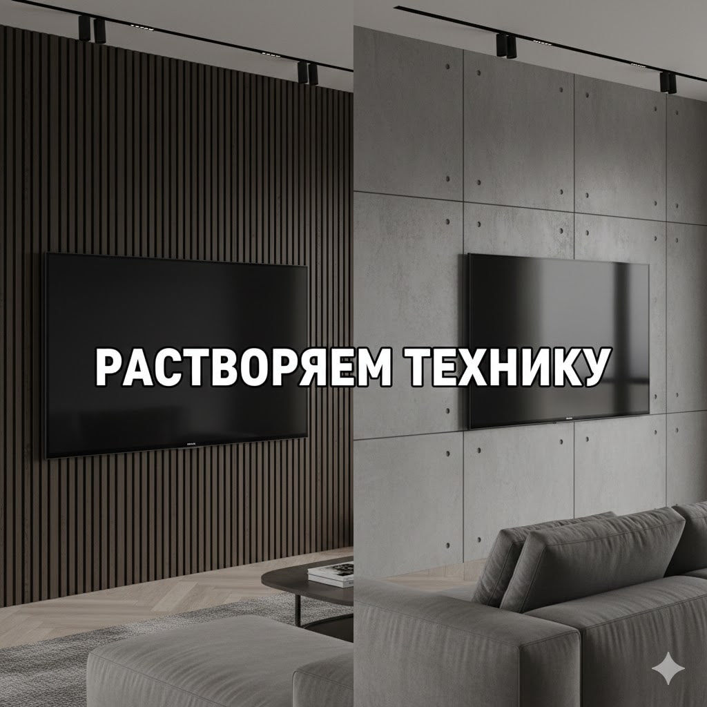 Частая ошибка: ремонт закончен, мебель стоит, и тут в центр стены вешается огромный черный экран. Как сделать так, чтобы ТВ был частью дизайна, а не его главной деталью? 3 рабочих приема: Темный фон. Разместите ТВ на темной акцентной стене (графитовый, глубокий синий, рейки из темного дерева). Черный экран «растворится» на таком фоне и не будет выбиваться. ТВ-галерея. Окружите телевизор картинами или постерами в рамках. В выключенном состоянии он станет просто еще одним объектом в вашей домашней галерее. Мебельные ниши. Впишите экран в систему стеллажей или шкафов. Когда он окружен полками с книгами и декором, он перестает доминировать. Важные технические моменты: — Высота. Центр экрана должен быть на уровне ваших глаз, когда вы сидите на диване. Не вешайте его под потолок, как в зале ожидания вокзала - шея скажет «прощай». — Кабель-канал. Продумайте закладную трубу в стене заранее, чтобы провода от приставки или роутера не свисали «соплями» вниз.
