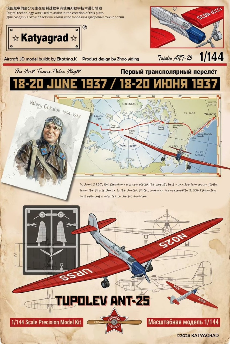 Позже будет набор самолета в 1/144 с фигуркой Чкалова в 1/32 масштабе.