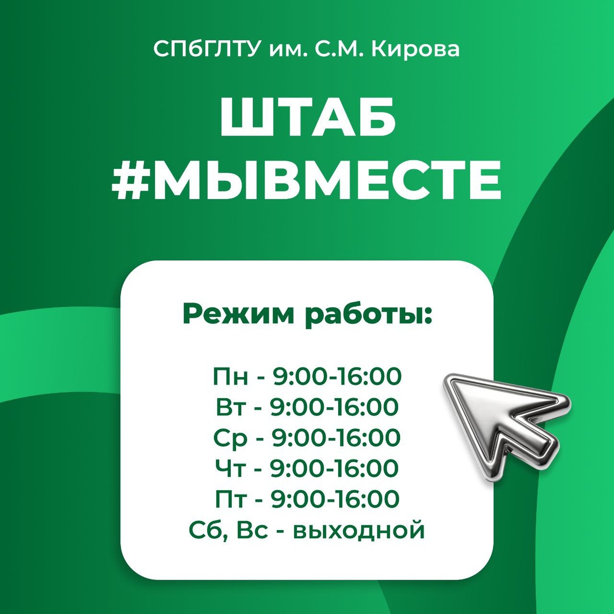 🕊 📦 Сбор ещё идёт! Штаб #МЫВМЕСТЕ работает с понедельника по птяницу, 9:00–16:00. Подробнее о том, что нужно и как передать — смотрите в группе Молодежь СПбГЛТУ 👈 Спасибо, что не остаётесь в стороне 💚 #СПбГЛТУ #СПБГЛТУ_анонс 👻 МАХ | 📲 ВК | 📝 ДЗЕН