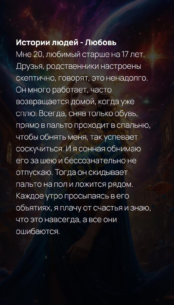 Истории людей - Любовь Мне 20, любимый старше на 17 лет. Друзья, родственники настроены скептично, говорят, это ненадолго. Он много работает, часто возвращается домой, когда уже сплю. Всегда, сняв только обувь, прямо в пальто проходит в спальню, чтобы обнять меня, так успевает соскучиться. И я сонная обнимаю его за шею и бессознательно не отпускаю. Тогда он скидывает пальто на пол и ложится рядом. Каждое утро просыпаясь в его объятиях, я плачу от счастья и знаю, что это навсегда, а все они ошибаются. #добротаспасетмир #случайвметро #добронавсегда #взаимовыручка #гуманизм #случайвпути #честность #каждыйважен #будни #добротаспасетмир #случайвметро #добронавсегда #взаимовыручка #гуманизм #случайвпути #честность #каждыйважен #будни расшифруйте свой уникальный код | расшифруйте свой уникальный код | расшифруйте свой уникальный код T | VK | Pin | YouTub | Dzen Истории людей - Любовь Мне 20, любимый старше на 17 лет.… #12число #12февраля