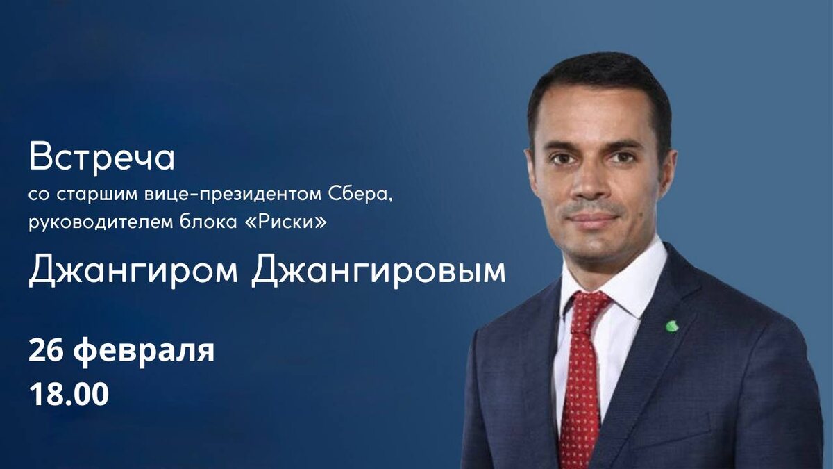 26 февраля в 18:00 пройдет встреча со старшим вице-президентом Сбера, руководителем блока «Риски» Джангиром Джангировым. Блок «Риски» объединяет сотни специалистов в области IT, машинного обучения, финансов, которые совместно идентифицируют и управляют новыми видами риска: технологического, модельного, ESG и др. Что обсудим на встрече: 🙂↕️Управление неопределенностью: какие шаги нужно предпринимать для предотвращения нежелательных событий в будущем и как с этим справляется Сбер. 🙂↕️Построение модели рисков: как именно компания выстраивает систему управления рисками и какие технологии использует для их минимизации и прогнозирования. 🙂↕️Проникновение ИИ в банки: как новые методики и алгоритмы меняют систему принятия решений в Сбере. 🔗 Регистрация 📍 ул. Миклухо-Маклая, 6, конференц-зал Экономического факультета #ИРЯ_анонс