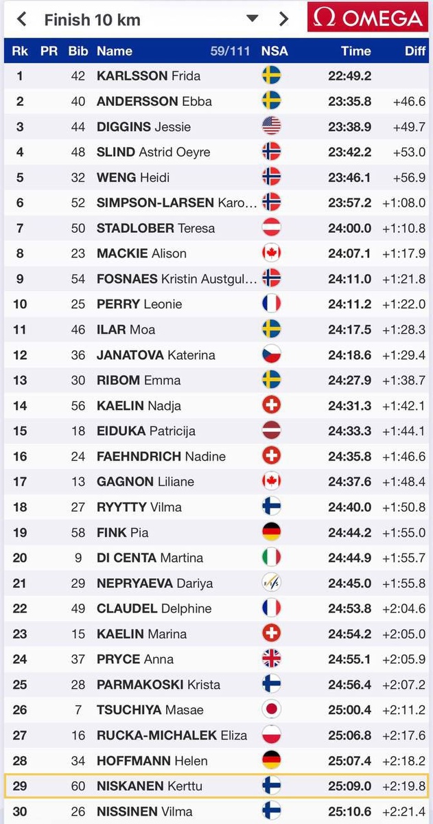 Лыжные гонки Раздельный старт, свободный стиль - 10 км Женщины 1.Фрида Карлссон 2.Эбба Андерссон 3.Джесси Диггинс Карлссон завоевала вторую золотую медаль. AIN Непряева на 21 месте AIN Королева на 45 месте. Всего 111 девушек. Результаты https://live.fis-ski.com/cc-2467/results-pda.htm