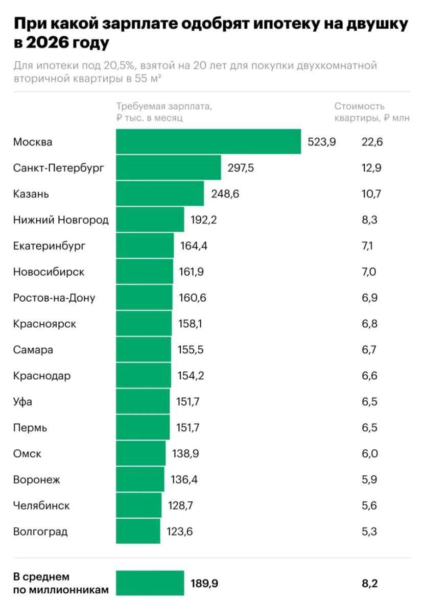 ? 🏠 Эксперты посчитали: при текущей ключевой ставке ипотека на вторичном рынке становится испытанием на прочность даже для семей с хорошим доходом. Разбираемся в цифрах. 📊 Что за условия рассматривались? Ипотека: 20,5% годовых, срок 20 лет, первоначальный взнос 20%. Покупаем двухкомнатную квартиру на вторичном рынке площадью 55 квадратных метров. 💰 Требуемый доход в крупнейших городах: • Москва — 523 900 ₽/мес (квартира 22,6 млн ₽) • Санкт-Петербург — 297 500 ₽/мес (12,9 млн ₽) • Казань — 248 600 ₽/мес (10,7 млн ₽) • Нижний Новгород — 192 200 ₽/мес (8,3 млн ₽) • Екатеринбург — 164 400 ₽/мес (7,1 млн ₽) • Новосибирск — 161 900 ₽/мес (7,0 млн ₽) • Ростов-на-Дону — 160 600 ₽/мес (6,9 млн ₽) • Красноярск — 158 100 ₽/мес (6,8 млн ₽) • Самара — 155 500 ₽/мес (6,7 млн ₽) • Краснодар — 154 200 ₽/мес (6,6 млн ₽) • Уфа — 151 700 ₽/мес (6,5 млн ₽) • Пермь — 151 700 ₽/мес (6,5 млн ₽) • Омск — 138 900 ₽/мес (6,0 млн ₽) • Воронеж — 136 400 ₽/мес (5,9 млн ₽) • Челябинск — 128 700 ₽/мес (5,6 м