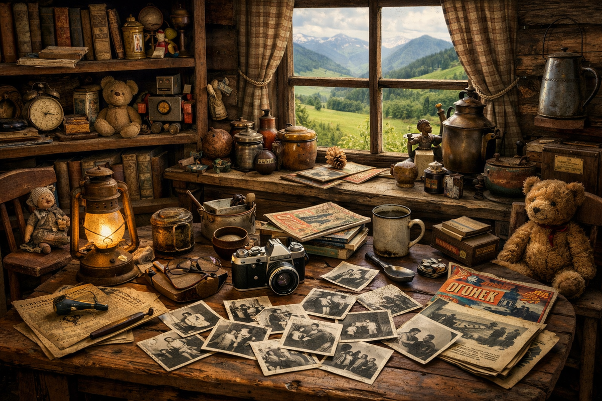 Я подхожу к столу и осматриваю его. На нём лежат старые газеты, домино, сломанные пластмассовые игрушки, алюминиевые ложки и вилки, штопор, фотоаппарат и рядом пленка, цветные карандаши и альбомы с детскими рисунками — это вещи из моего детства.