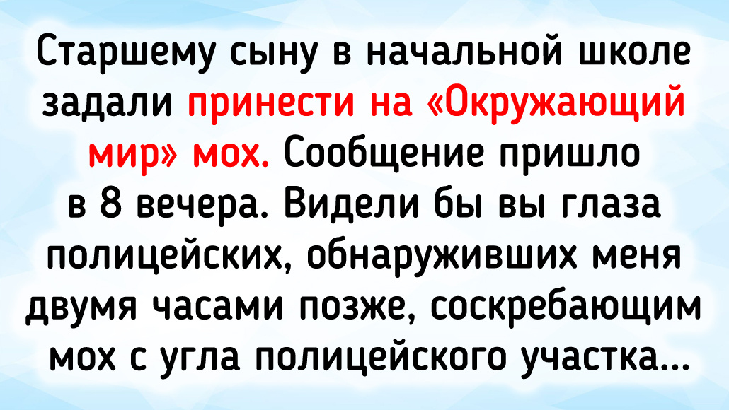 Старшему сыну в начальной школе задали принести на «Окружающий мир» мох. Сообщение пришло в 8 вечера. Видели бы вы глаза полицейских, обнаруживших меня двумя часами позже, соскребающим мох с угла полицейского участка. На вопрос, что я делаю, честно ответил, что собираю мох на урок сыну. В ответ мне был дан совет делать это днем, когда лучше видно. © Андрей Проскурин / Dzen