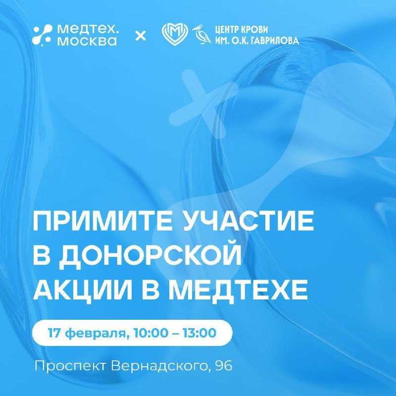 💙 День донора в Медтехе Напоминаем, что уже в следующий вторник, 17 февраля с 10:00 до 13:00, в нашем Технопарке пройдёт донорская акция. Это возможность сделать простой, но очень важный поступок, результатом которого может стать спасённая жизнь. Привилегии доноров: 🔵 Право на 2 выходных дня (по месту работы) 🔵 Денежная компенсация на питание: 1736 ₽ Чтобы присоединиться, заполните форму по ссылке до 16 февраля, 12:00. ➖ Время: 17 февраля, 10:00-13:00 ➖ Место: Технопарк Медтеха (м. Тропарёво, проспект Вернадского, 96) Перед донацией загляните в памятку – там всё о подготовке и восстановлении. Инициатива организована совместно с Центром крови им. О.К. Гаврилова.