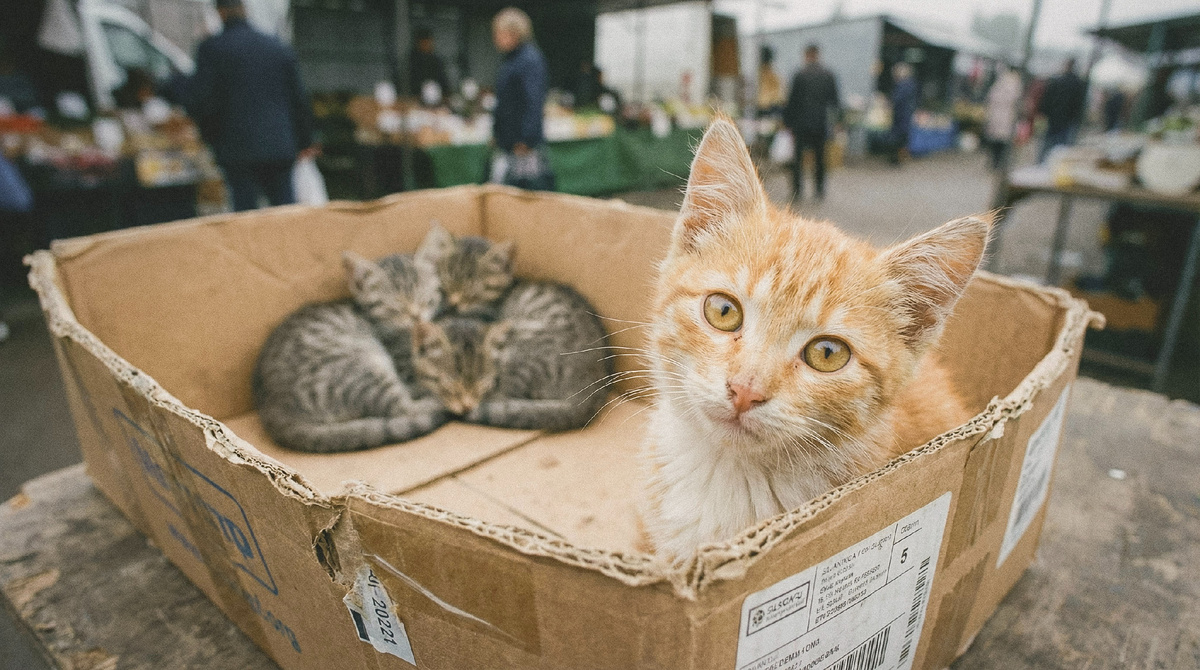 Корм для Зорьки заканчивался каждую субботу. Людмила могла бы покупать его в магазине у дома. Но на рынке выбор больше, а Зорька, соседская кошка, привередничала. Пока Нина Васильевна лежала в больнице после операции, Людмила обещала присматривать. Вот и присматривала: заходила утром и вечером, меняла воду, чистила лоток, разговаривала. Зорька слушала, щурилась, иногда даже мурчала в ответ. Своих животных у Людмилы не было. И не надо - лишние хлопоты, шерсть везде, ветеринары эти. Сорок восемь лет, работа, квартира, тишина по вечерам. Всё как у всех. На рынок она приехала к десяти - не слишком рано, но и толпы уже нет. День выдался холодным, ветер тянул между рядами, трепал края навесов. Людмила поправила шарф и пошла привычным маршрутом: мимо клеток с попугаями, мимо аквариумов, мимо собачьего ряда - там всегда лаяли так, что закладывало уши. Ряд с кошками она обычно проходила быстро. Смотреть не на что: те же котята, те же коробки, те же продавцы. Но сегодня почему-то замедлила шаг.