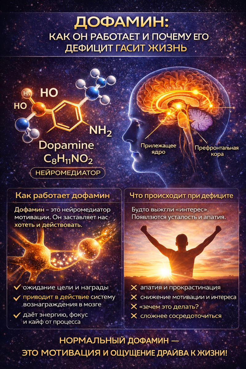 Как он работает Когда вы предвкушаете результат — цель, награду, похвалу, победу — мозг выделяет дофамин. Он усиливает передачу сигналов в так называемой системе вознаграждения (включая прилежащее ядро и префронтальную кору). Это даёт: Важно: дофамин больше связан с ожиданием награды, чем с самой наградой. Он запускает движение к цели. При низком уровне дофамина человек часто сталкивается с: Со временем это может отражаться на работе, отношениях, самооценке. Мир кажется «плоским», а цели — бессмысленными. Именно поэтому дефицит дофамина способен буквально «выключать» ощущение драйва жизни. Дофамин любит прогресс. Малые выполненные задачи, спорт, новизна, чёткие цели, качественный сон и ограничение «быстрой стимуляции» помогают восстановить естественную чувствительно