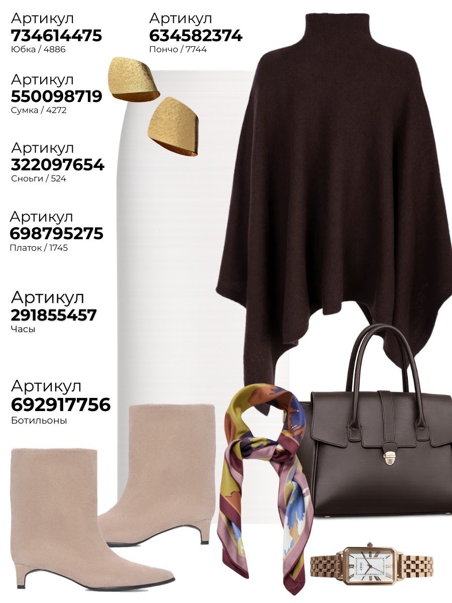 Иногда самый эффектный стиль — тот, что не пытается впечатлить громкими приёмами. Он работает иначе: глубокие оттенки, тактильные фактуры, идеальная геометрия и точные аксессуары. На фото — образ из этой категории: шоколадное пончо с высоким воротом, спокойная юбка, благородная сумка, мягкие бежевые ботильоны и несколько акцентов, которые делают комплект не просто «красивым», а действительно продуманным.