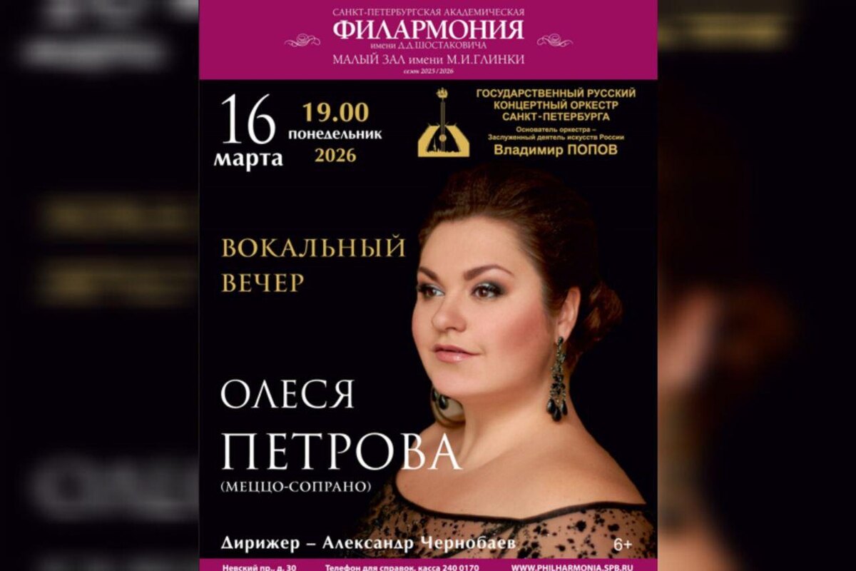 На сцене малого зала Филармонии Санкт-Петербурга 16 марта пройдет сольный концерт меццо-сопрано Олеси Петровой в сопровождении Государственного Русского концертного оркестра Санкт-Петербурга (основатель – заслуженный деятель искусств России Владимир Попов). Об этом сообщает пресс-служба организаторов. «Имя петербургской певицы Олеси Петровой прекрасно известно всем поклонникам оперного искусства. Звезда мировой оперной сцены – обладательница роскошного меццо-сопрано, диапазон её вокальных возможностей поистине безграничен. Богатейший тембр голоса, виртуозная вокальная техника, особая интеллектуальная манера исполнения – вот те качества, которые так притягивают внимание искушенной публики», – сообщают представители мероприятия. В предстоящем концерте прозвучат арии из опер Чайковского, Даргомыжского, Бизе, романсы Рахманинова, русские песни. Дирижер – Александр Чернобаев. Продолжительность концерта 2 часа. Время: 16 марта 2026 года, в 19:00. Возрастное ограничение: 6+ Ранее мы писали, ч