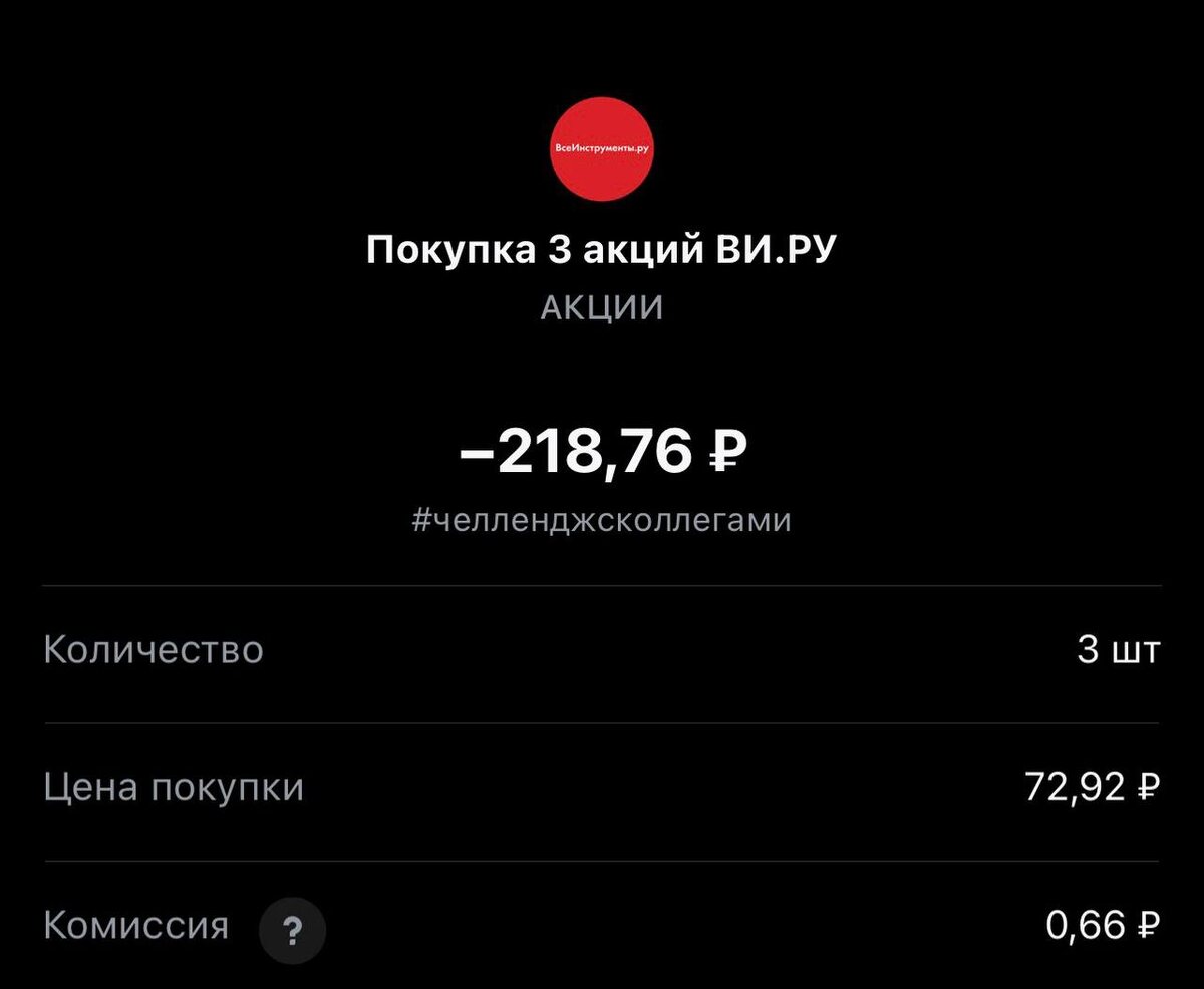 ! Покупка на сегодня #366 Статистика портфеля на стороннем сервисе, можно посмотреть по "ссылке" Напомню это челлендж с коллегами, каждый рабочий день пополняем брокерский счет на 250 рублей и инвестируем. Если возникли вопросы или есть не понимание, что делать. Задавайте «тут» Покупка #366 🟢 “ВИ.РУ” 72.92 rub #VSEH 3 лота #каждыйсможет #челенджсколлегами ✈️ Стас Мироненко