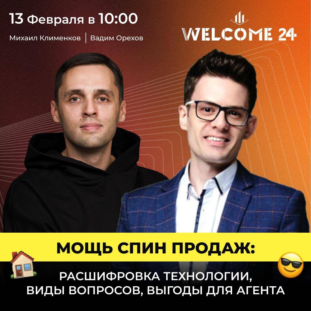 ». А иногда после часа общения вы получаете: «Мы подумаем…» ❗️Все дело в правильных вопросах. Сильный агент ведёт клиента так, что решение он принимает сам. Завтра мы проводим вебинар: «Мощь СПИН-продаж: расшифровка технологии, виды вопросов, выгоды для агента». 🗣 Спикеры: • Михаил Клименков — CEO WELCOME 24 • Вадим Орехов — тренер агентов, эксперт с 2013 года, автор книги «Золотой стандарт продаж» 📅 13.02 в 10:00 по мск 📍 Вебинар пройдет в Яндекс Телемост, ссылку пришлём перед началом Ставь напоминание, чтобы не пропустить!
