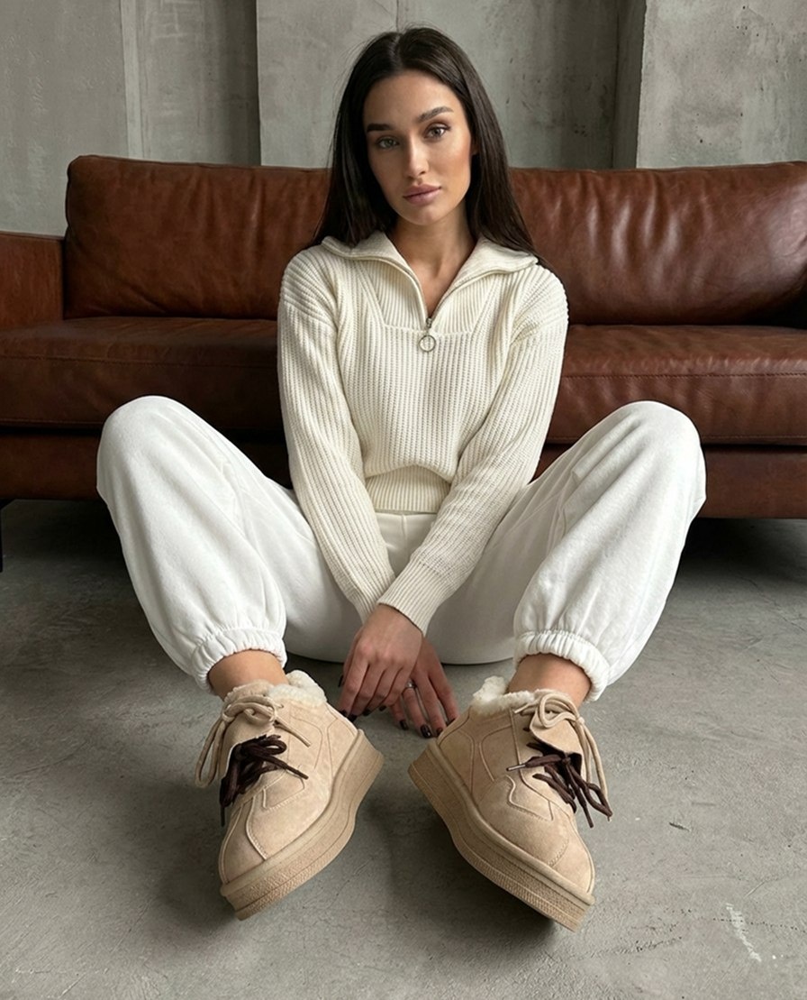 Велюровые кеды LAUF! с двойной шнуровкой в бежевом оттенке выглядят лаконично, современно и стильно.