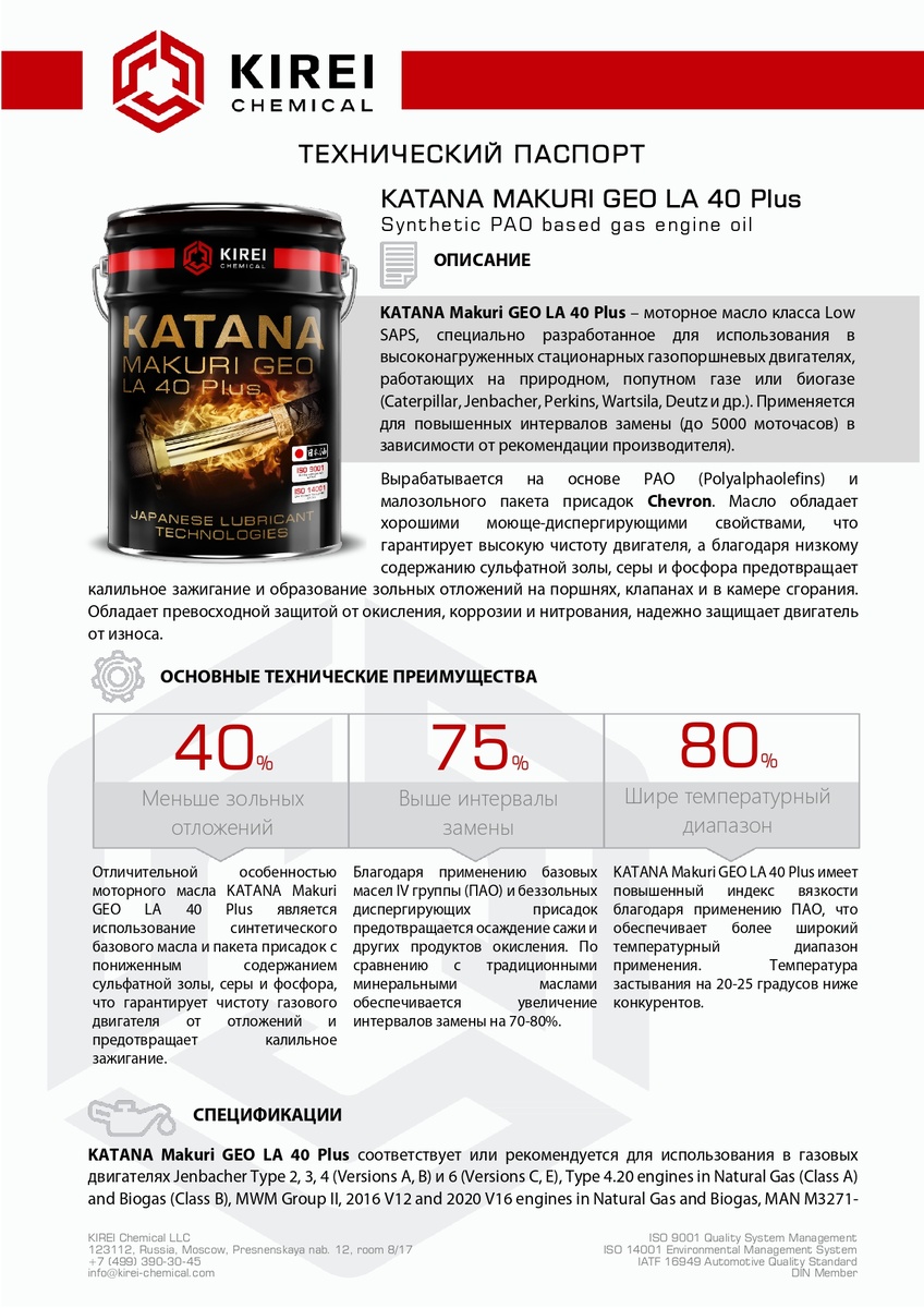 Добрый день, коллеги. Для владельцев ГПУ с объёмом картера до 50 литров, появилась возможность приобрести KATANA MAKURI GEO LA 40 PLUS и KATANA MARU GEO LA 40 по спец. цене в фасовке 20 литров! Мы проведём Программу Промышленного Мониторинга KATANA, что позволит вам убедиться в том, что наши продукты не только обеспечат вам экономию за счёт увеличения интервала замены масла на 75 и 30 процентов, но и при дальнейшей работе на нашем масле мы поможем вам безопасно эксплуатировать двигатели, посредством постоянного мониторинга состояния двигателя через анализ проб масла в лаборатории МИЦ ГСМ. Повторюсь, ООО"Кирэй" несет полную ответственность производителя за качество произведенного и поставленного продукта в рамках Страхового Сертификата 25 млн.руб.(полиса страхования ответственности за качество товаров, работ (услуг) № 0991R/780/50012/25 от 07 сентября 2025 г.