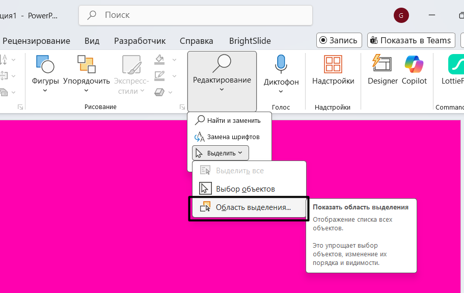 В главной панели нужно найти кнопку "Редактирование" - "Выделить" - "Область выделения"