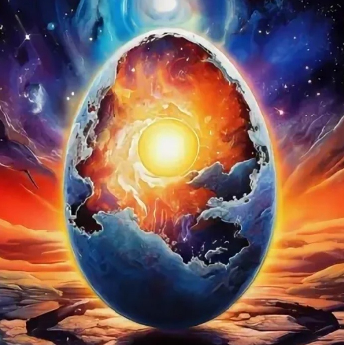 В материальном мире скорость происходящих в нём процессов ограничена скоростью света. Скорость падения может превышать скорость света. И в итоге эти явления приводят к тому, что появляется некая граница между этой трансформирующейся частью хтони и её первичным состоянием. И пространство, претерпевающее изменения, отделяется от первоначальной хтони, и там возникают самостоятельные процессы. Выделившееся из хтони пространство начинает жить по своим законам. В незыблемой изначальной устойчиво существующей хтони – в первородном хаосе, в первичной пустоте, рождается полость, кокон, скорлупа, внутри которой функционирует продолжающий своё сжатие сгусток, клубок (яйцо), внутренние части которого устремляются к его ядру с гораздо бóльшей силой тяготения, нежели наружные. Рождается Мировое Яйцо. О творении Мира, о Мировом Яйце нам поведала птица Гамаюн, а сиё повествование сохранила «Книга Коляды»: «W! (Ом!) Бог сущий и Бог Всевышний! W! (Ом!) Родитель и Нерождённый! W!(Ом!) Бог Истинный, Всемогущий! W! (Ом!) Святой и Неизречённый! Эта песнь о Тебе – Родитель! Люди, слушайте птицы песнь!