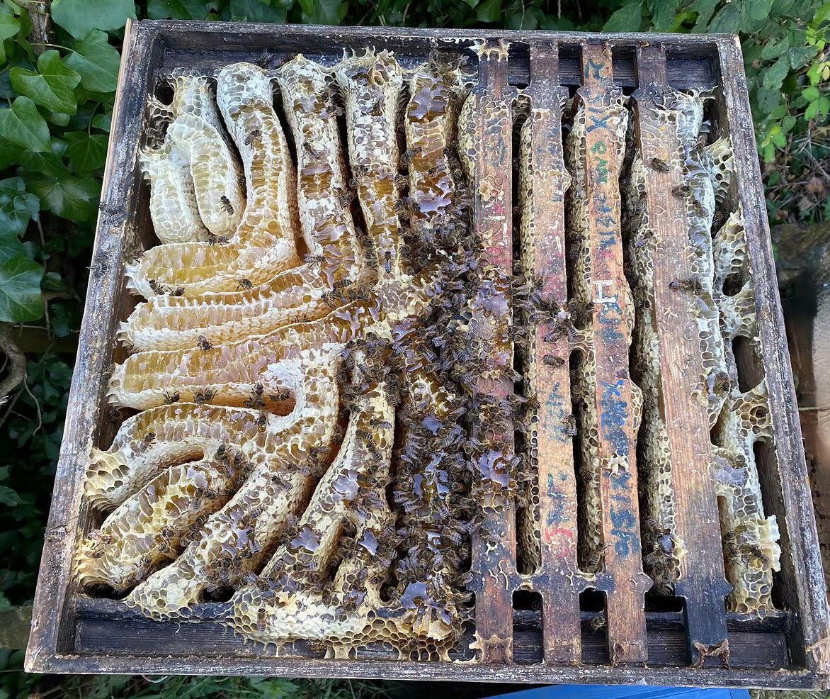 Хотя эта семья, строго говоря, не живет в естественной среде обитания, это удивительный пример того, как пчелы следуют своим естественным инстинктам, предоставленные сами себе. Этот тонкостенный улей находится в полном запустении, у северной изгороди, куда не попадает солнце, и, по словам землевладелицы, последние 4 года в нём жили пчелы. Она хотела, чтобы улей перенесли. При ближайшем рассмотрении я увидел, что эти выжившие пчелы были заметно волосатыми, довольно маленькими, очень активными и, судя по всему, выглядели очень здоровыми. Верхний корпус был полностью сгнившим, с большей частью пустующих сотов. Нижний корпус с расплодом был не намного лучше, но тем не менее, населен пчелами и запасами. Правая сторона корпуса содержала рамки, а левая — остатки двух грязных пластиковых кормушек. Я мало что мог сделать, перенеся или переселив семью, не подвергая её существованию риску. Я убрал остатки кормушек, чтобы освободить место для пчел, затем накрыл их утепленной крышей и оставил их