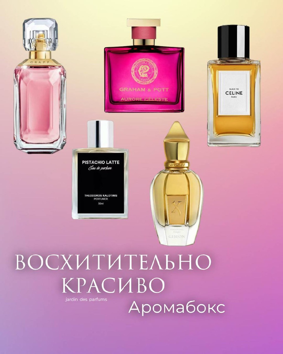 В преддверии весны и 8 марта я собрала для милых дам новенький аромабокс, который там многие ждали. Стильные, гармоничные, роскошные композиции вошли в этот обзор...я очень старательно всегда подбираю ароматы для таких сетов, тк мне хочется обьединить парфюм одной идеей, чтобы вся подборка оставила для вас массу положительных впечатлений. Комплименты новинкам я получила в первый же вечер...сама не ожидала, хотя, у меня на лице, скорее всего, было написано, что это просто шедевры. Такой красоты точно достойна каждая из нас. Потом будете расстраиваться, что ароматы быстро закончились - это лимитированный выпуск, некоторые ароматы нужно ожидать месяцами. В сете 5 ароматов: Xerjoff Gibeon Theodoros Kalotinis Pistachio Latte Graff Lesedi La Rona VIII Celine Black Tie Graham & Pott Aurore Celeste