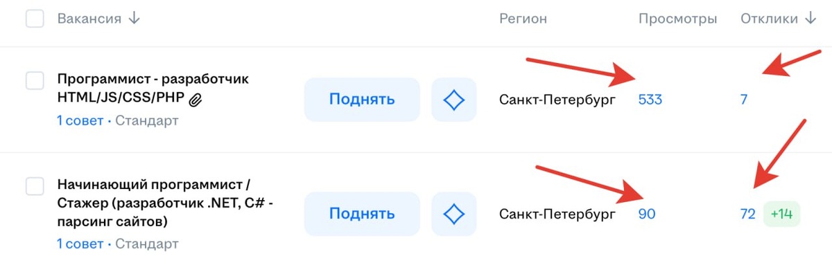 В первой вакансии мы просим сразу тестовое сделать, а во второй - не просим. Вот, цифры на картинке... :) по отликам.