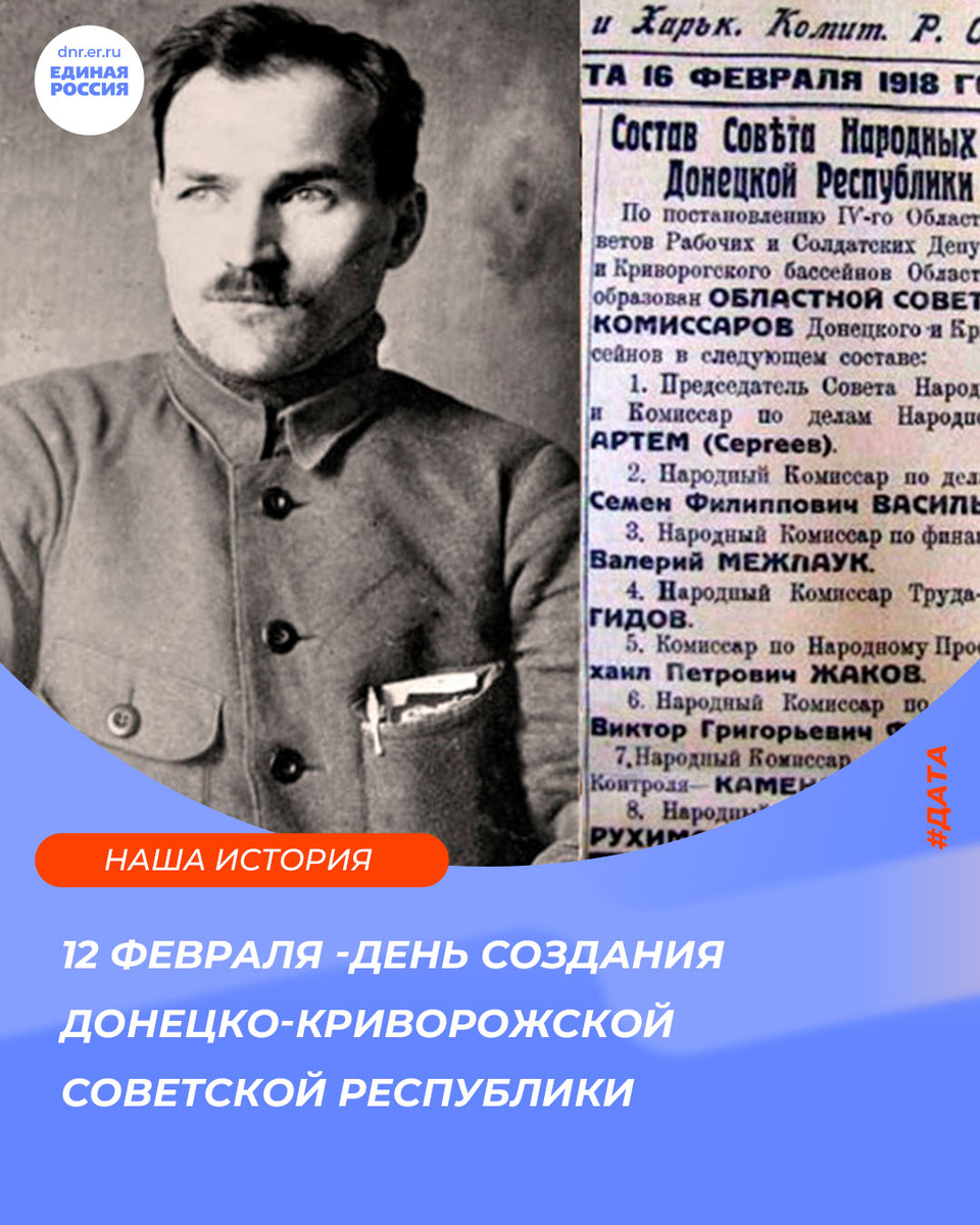 12 февраля 1918 года в Харькове IV областной съезд Советов Донецкого и Криворожского бассейнов провозгласил создание Донецко-Криворожской советской республики. Было заявлено, что она входит в состав Российской Советской Республики на правах автономной области. Уголь и сталь Донбасса должны принадлежать тем, кто их добывает. Во главе республики встал легендарный товарищ Артём – харизматичный революционер Фёдор Сергеев, сумевший объединить инженеров и шахтёров. В состав правительства вошли семеро большевиков, тое левых эсеров, один меньшевик. Границы республики включали Харьковскую и Екатеринославскую губернии, Криворожье, уезды Таврической губернии и восточные районы Донбасса. Столицей был определён Харьков. В условиях хозяйственного хаоса новая власть стремилась выстроить управляемую экономическую систему. Был создан Южный областной совет народного хозяйства, координировавший работу шахт, заводов и железных дорог. Крупная промышленность переходила под контроль государства, вводился вос