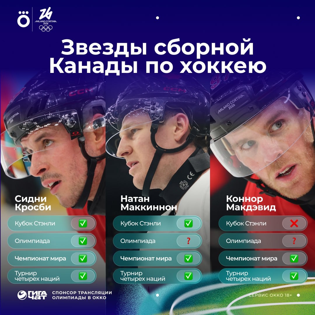 🤩 Кросби – единственный член «Тройного золотого клуба» на ОИ. А Маккиннон и Макдэвид попробуют выиграть свою первую Олимпиаду. 🏆 Смотри матч Чехия – Канада в 18:40: okko.tv/s/x4b