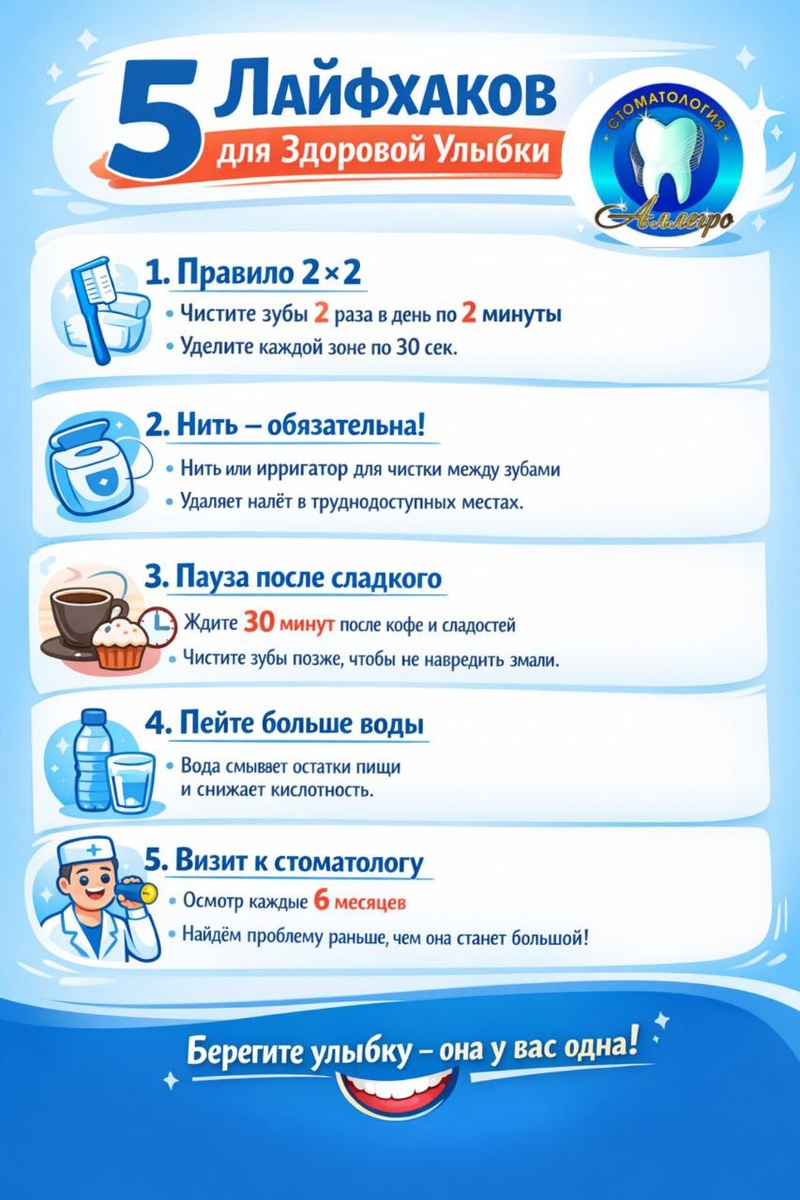 😄 (но мы всё равно будем рады вас видеть в «Аллегро» в Краснодаре) Иногда зубы болят не потому что «внезапно», а потому что «ну я же потом почищу». Знакомо? Ловите 5 простых лайфхаков для здоровой улыбки: 1️⃣ Правило 2×2 2 раза в день по 2 минуты. Это меньше, чем вы проводите в Telegram за один заход 😉 2️⃣ Нить — это не роскошь Щётка не добирается между зубами. А кариес — добирается. Делайте выводы. 3️⃣ После кофе — пауза Подождите 30 минут перед чисткой. Эмаль скажет вам спасибо (и не станет чувствительной). 4️⃣ Вода — лучший друг зубов Смывает остатки еды и снижает кислотность. Бонус: свежее дыхание без жвачки. 5️⃣ Осмотр раз в 6 месяцев Если зуб не болит — это не значит, что он ничего не планирует 😅 Профилактика всегда дешевле лечения. В стоматологии «Аллегро» в Краснодаре мы за красивые улыбки без стресса