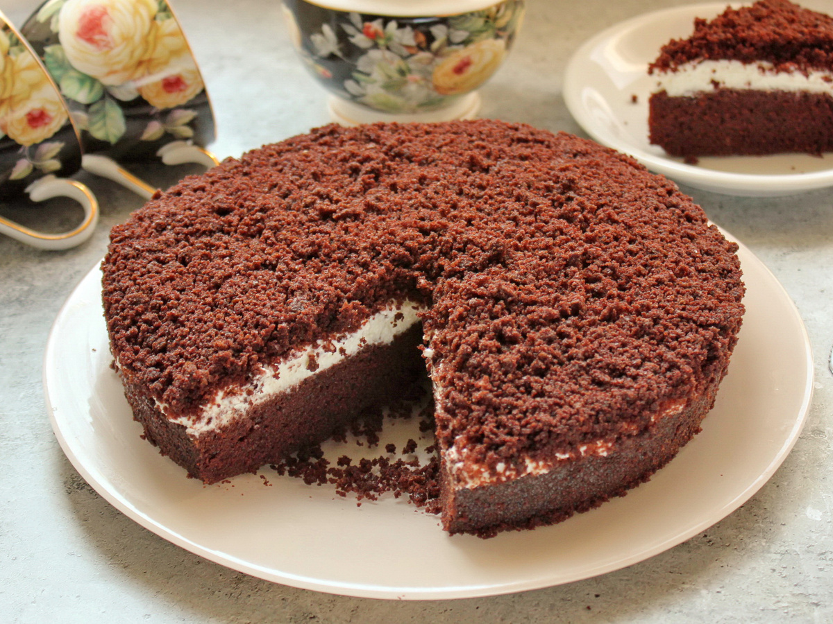 Пирог влажный, нежный, ароматный - вкус насыщенный, шоколад чувствуется ярко, но не грубо. Всё сбалансировано - и сладость, и лёгкая кофейная нотка, и нежность сметанного крема. А структура на разрезе - прям глаз радуется! Полный список ингредиентов - в конце⤵️ Сначала занимаемся тестом. Берем 70 г шоколада, рубим ножом и выкладываем в миску. Добавляем 2 столовые ложки какао. В 180 мл горячей воды растворяем 1 чайную ложку растворимого кофе и сразу вливаем эту горячую смесь к шоколаду и какао. Перемешиваем до полного растворения, чтобы не осталось комков и кусочков. В отдельной миске разбиваем 2 яйца и всыпаем 150 г сахара. Взбиваем до светлой массы. Вливаем 60 мл рафинированного подсолнечного масла, снова перемешиваем. Соединяем обе смеси - шоколадную и яичную. Перемешиваем до однородности. Добавляем 200 г пшеничной муки и 2 чайные ложки разрыхлителя. Тщательно размешиваем. Тесто получается достаточно жидким - это правильно, именно так корж будет сочным. Выливаем тесто в форму. Выпека