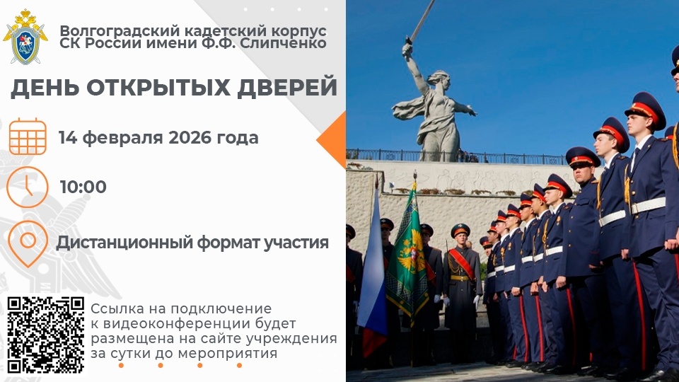14 февраля 2026 года в 10:00 в ФГКОУ «Волгоградский кадетский корпус Следственного комитета Российской Федерации имени Ф.Ф. Слипченко» в формате видеоконференцсвязи состоится День открытых дверей.