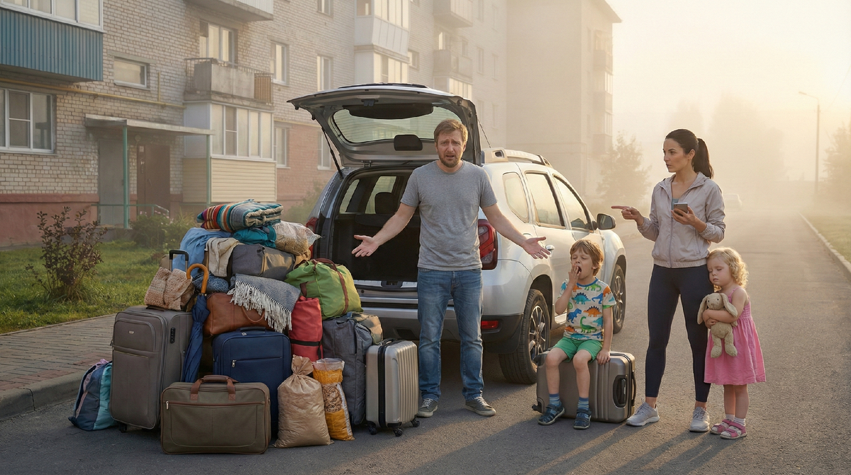 Знаете, что общего между семейной поездкой на машине и марафоном? И там, и там ты на середине пути клянёшься, что больше никогда. А через месяц снова собираешь чемоданы. У нас это ежегодная традиция. Шестьсот километров до родителей на машине. Я за рулём, жена Лена штурманит, а на заднем сиденье Мишка (семь лет) и Соня (четыре года). Лена называет это «семейным приключением». Я называю это по-другому. Но цензура Дзена не пропустит. Начинается всё одинаково. Утро. Пять часов. Двор. Машина с открытым багажником. И гора вещей размером с однокомнатную квартиру. Лена командует: — Ещё зонт на всякий случай и мамин плед. Я смотрю на наш Рено Дастер. Потом на гору. Потом снова на машину. Это не КамАЗ. Но Лена считает, что надо быть готовым ко всему. Зонт, два пледа, аптечка размером с чемодан, утюг (а вдруг у мамы сломался), три комплекта одежды на каждого ребёнка. Это на два дня поездки, если что. Грузим сорок минут. Сорок. Минут. К слову, утюг мы ни разу не доставали за все поездки. У тёщи с