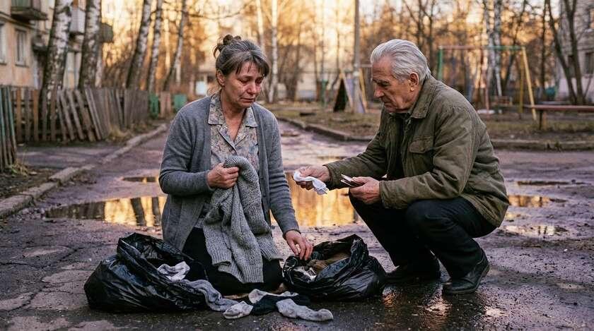 В какой-то момент один пакет порвался. Вещи высыпались на асфальт. Свитер, носки, старые тапочки. Я присела и начала собирать их. Руки дрожали,текли слезы — тихие, горячие.