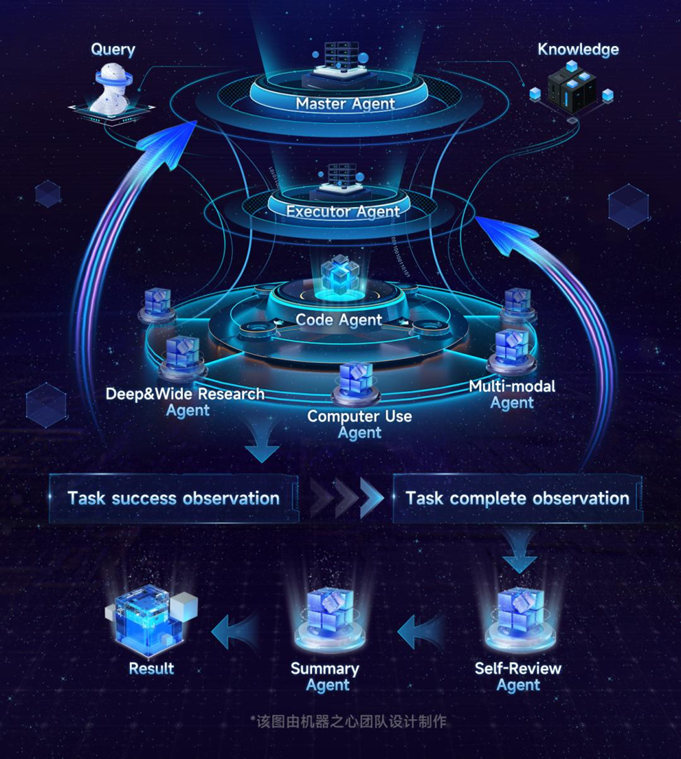 - встроенная внешняя память, механизм самодиагностики и самообучения агентов (self‑evolving modules);